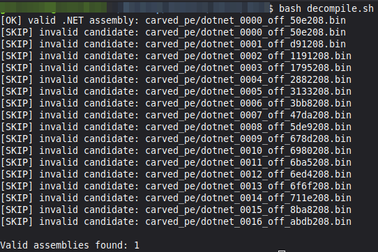 I file estratti tramite memory carving sono stati successivamente analizzati utilizzando ILSpy tramite l’interfaccia a riga di comando (ilspycmd). A tal fine è stato utilizzato uno script bash che iterava automaticamente su tutti i candidati estratti, tentando la decompilazione di ciascun file e conservando solo quelli per cui l’operazione risultava completata con successo.