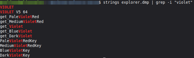 Abbiamo quindi ripreso in mano il dump di explorer.exe ed eseguito una semplice ricerca tramite grep della keyword violet per verificare se emergessero riferimenti utili. Tra le stringhe individuate compare la dicitura “VIOLET V5 64”.