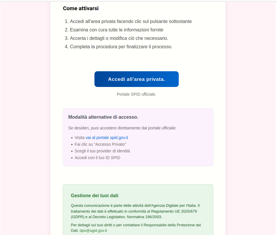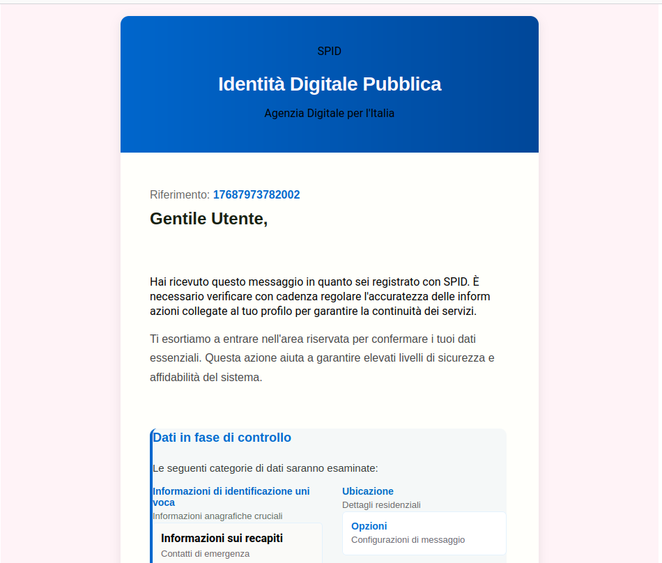 È stata individuata dal CERT-AGID una nuova campagna di phishing a tema SPID finalizzata ad acquisire, in modo fraudolento, dati personali e bancari.
