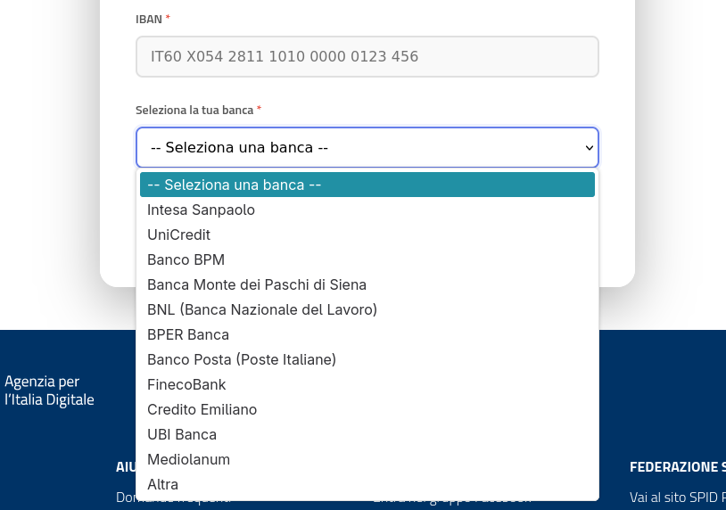 La vittima è quindi invitata ad inserire generalità, indirizzo di residenza, indirizzo email, numero di telefono ed infine IBAN del proprio conto corrente e relativo istituto bancario. Inoltre, la pagina riporta oltre al logo di AgID anche quello del Dipartimento per la Trasformazione Digitale.
