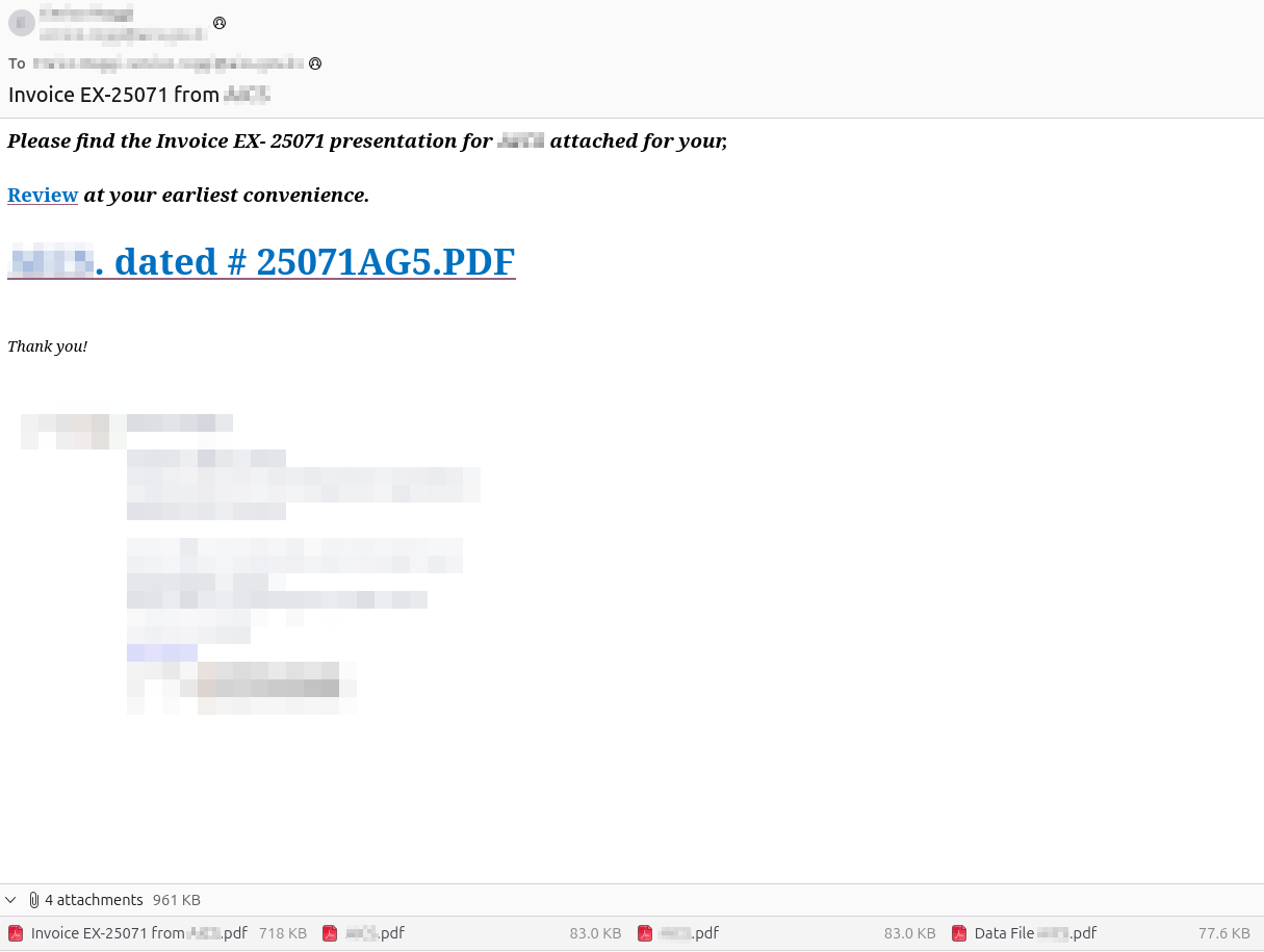 I messaggi risultano inviati dalla casella mittente verso sé stessa, mentre i reali destinatari (le vittime) non sono visibili perché inseriti in copia conoscenza nascosta (CCN). La comunicazione invita l’utente a cliccare sul link presente nel corpo dell’email e contiene diversi allegati PDF che simulano documenti amministrativi relativi a fatture o presentazioni.