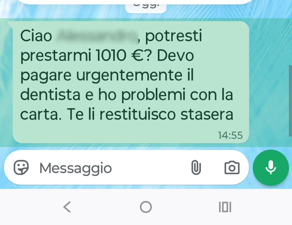 Negli ultimi giorni stiamo osservando un aumento di segnalazioni relative a una truffa diffusa tramite WhatsApp. Il messaggio arriva da un contatto conosciuto e chiede con urgenza una somma di denaro, spesso per una spesa imprevista come cure mediche o problemi vari, tramite la carta di pagamento.