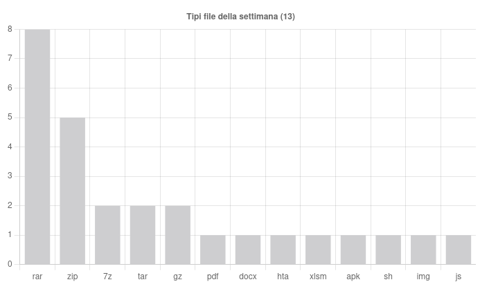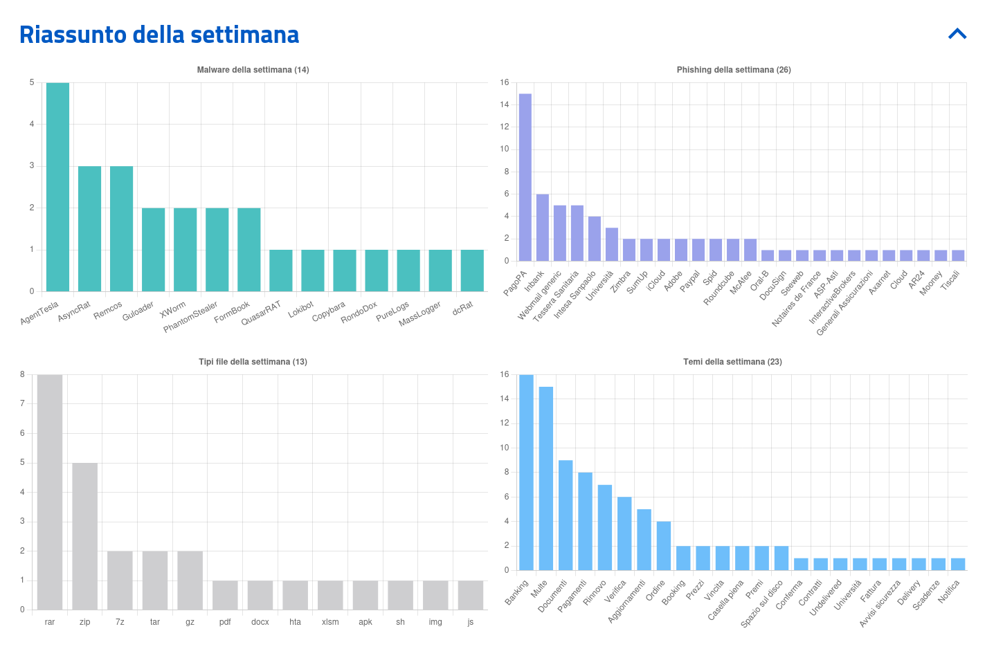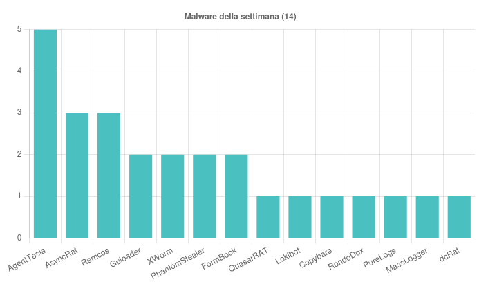 Sono state individuate, nell’arco della settimana, 14 famiglie di malware che hanno interessato l’Italia. Nello specifico, di particolare rilievo, troviamo le seguenti campagne: