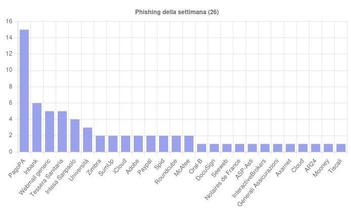 Sono 26 i brand della settimana coinvolti nelle campagne di phishing. Per quantità spiccano le campagne a tema PagoPA, Inbank e Tessera Sanitaria.