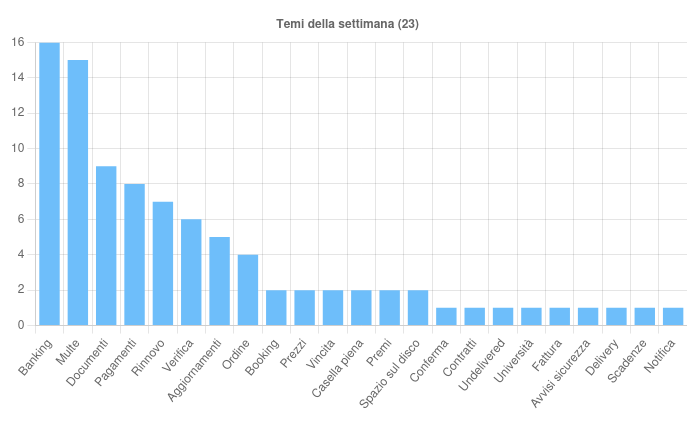 Sono 23 i temi sfruttati questa settimana per veicolare le campagne malevole sul territorio italiano. In particolare si rileva: