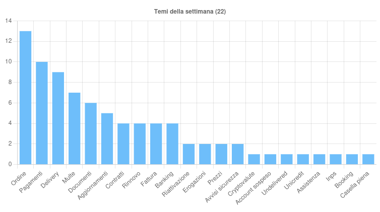 Sono 22 i temi sfruttati questa settimana per veicolare le campagne malevole sul territorio italiano. In particolare si rileva: