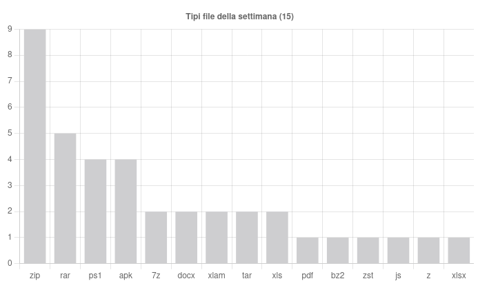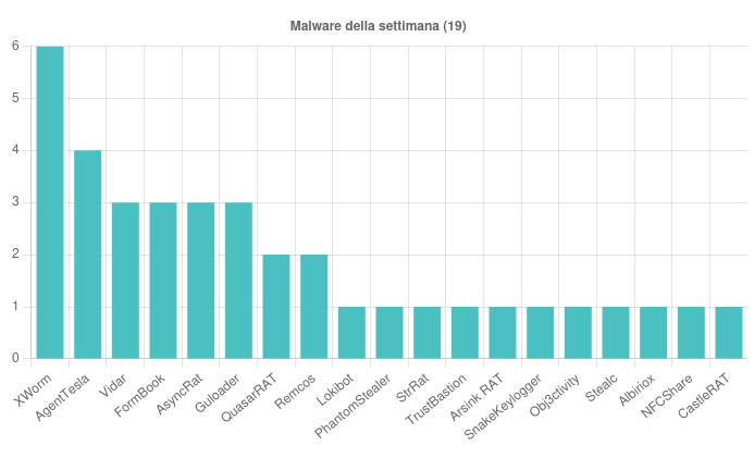 Sono state individuate, nell’arco della settimana, 19 famiglie di malware che hanno interessato l’Italia. Nello specifico, di particolare rilievo, troviamo le seguenti campagne: