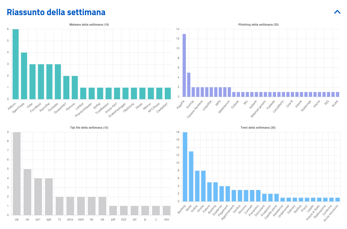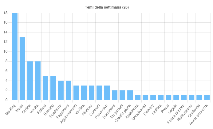 Sono 26 i temi sfruttati questa settimana per veicolare le campagne malevole sul territorio italiano. In particolare si rileva:
