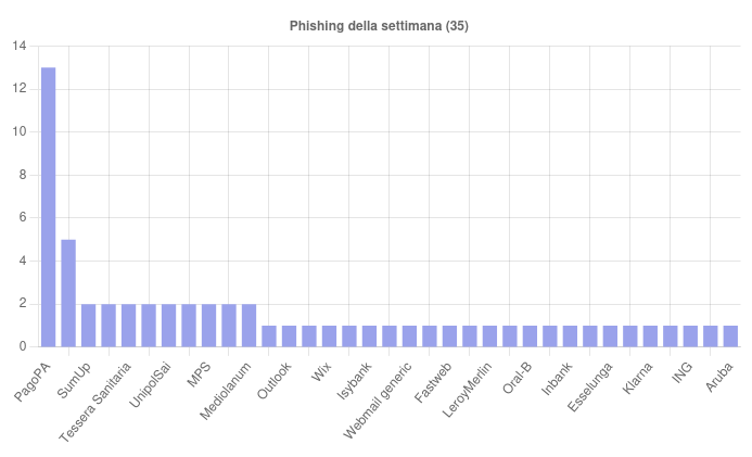 Sono 35 i brand della settimana coinvolti nelle campagne di phishing. Per quantità spiccano le campagne a tema PagoPA e SumUp.