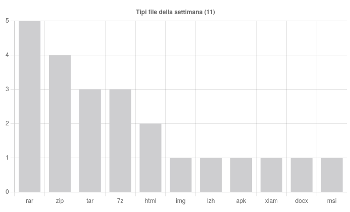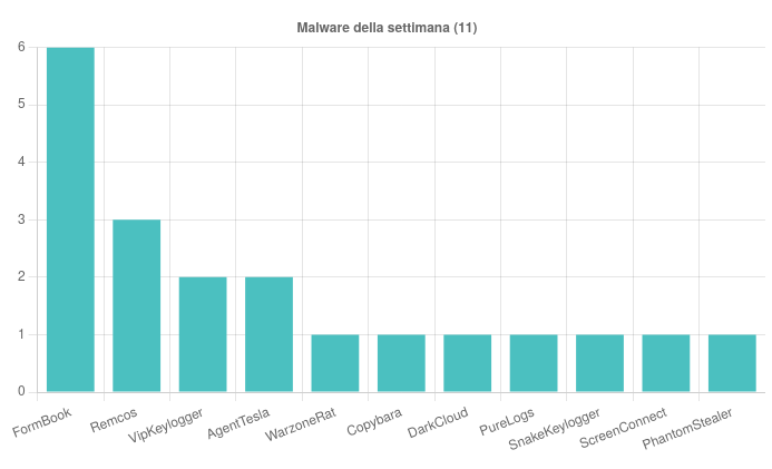 Sono state individuate, nell’arco della settimana, 11 famiglie di malware che hanno interessato l’Italia. Nello specifico, di particolare rilievo, troviamo le seguenti campagne: