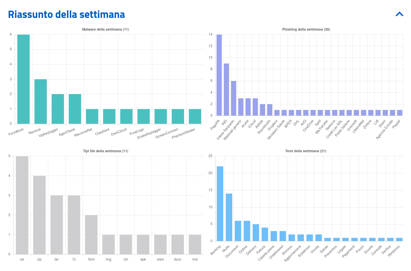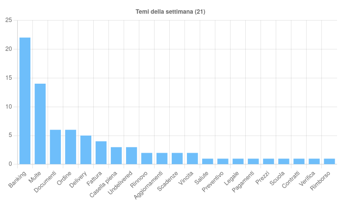 Sono 21 i temi sfruttati questa settimana per veicolare le campagne malevole sul territorio italiano. In particolare si rileva:
