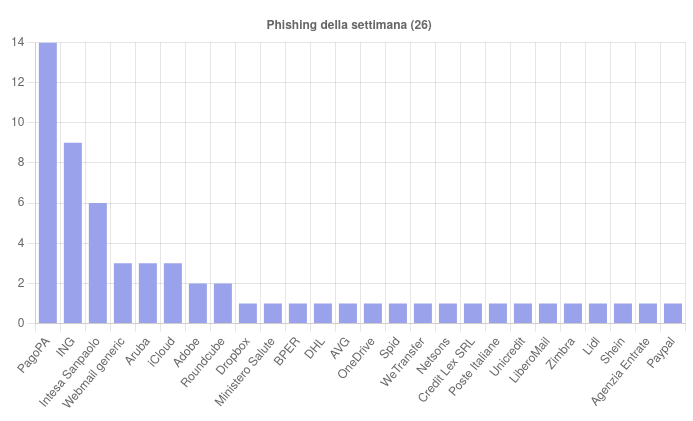 Sono 26 i brand della settimana coinvolti nelle campagne di phishing. Per quantità spiccano le campagne a tema PagoPA, ING e Intesa Sanpaolo.