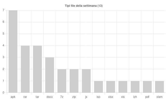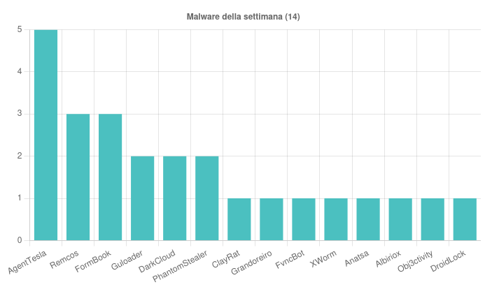 Sono state individuate, nell’arco della settimana, 14 famiglie di malware che hanno interessato l’Italia. Nello specifico, di particolare rilievo, troviamo le seguenti campagne: