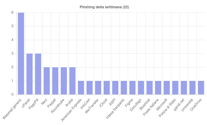 Sono 22 i brand della settimana coinvolti nelle campagne di phishing. Per quantità spiccano le campagne a tema cPanel e PagoPA, oltre alle sempre presenti campagne di Webmail non brandizzate.