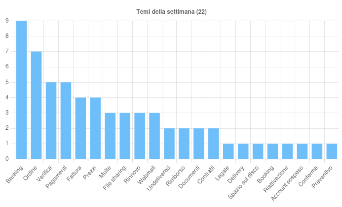 Sono 22 i temi sfruttati questa settimana per veicolare le campagne malevole sul territorio italiano. In particolare si rileva: