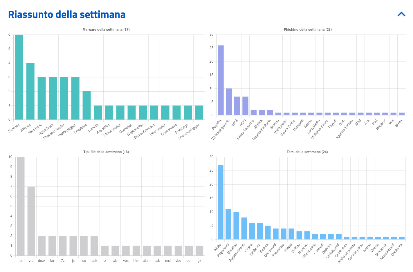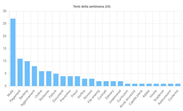 Sono 24 i temi sfruttati questa settimana per veicolare le campagne malevole sul territorio italiano. In particolare si rileva: