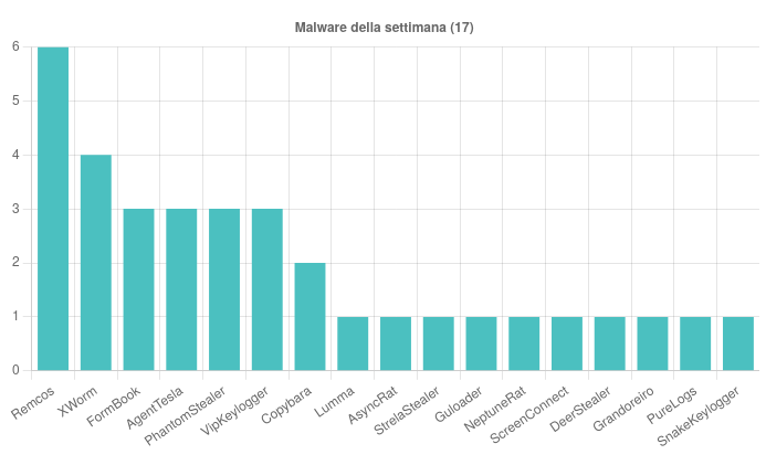 Sono state individuate, nell’arco della settimana, 17 famiglie di malware che hanno interessato l’Italia. Nello specifico, di particolare rilievo, troviamo le seguenti campagne: