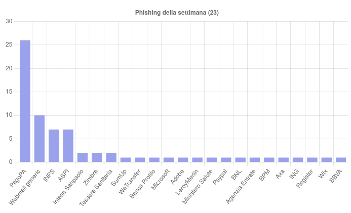 Sono 23 i brand della settimana coinvolti nelle campagne di phishing. Per quantità spiccano le campagne a tema PagoPA, INPS e Autostrade per l’Italia, oltre alle sempre presenti campagne di Webmail non brandizzate.