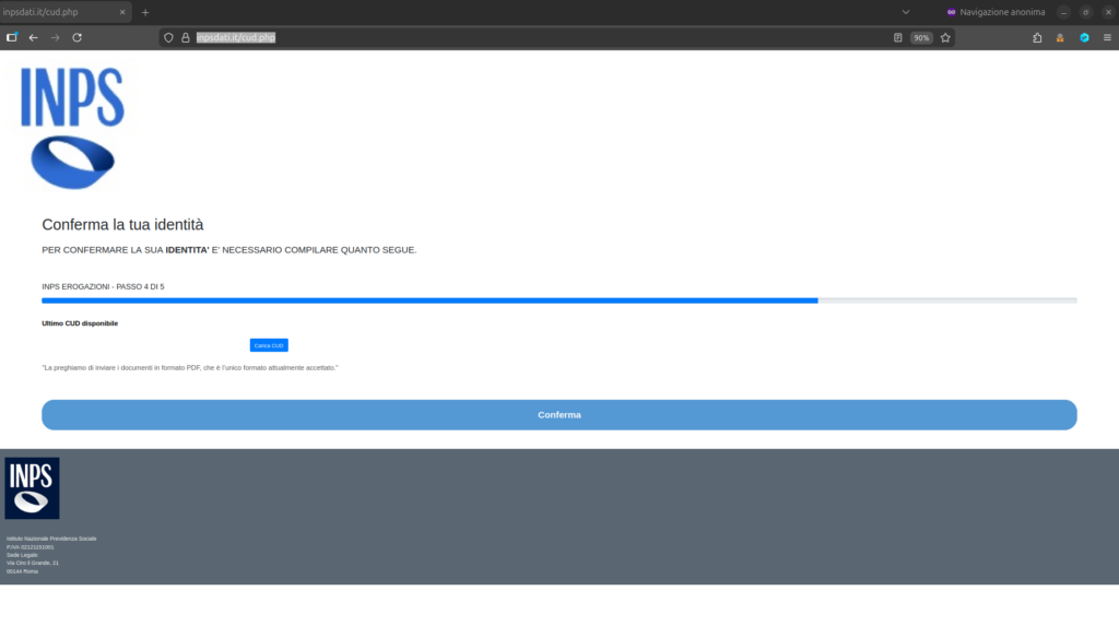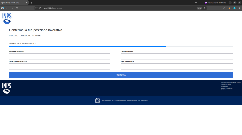 Dall’analisi eseguita dal CERT-AGID, emerge un aggiornamento nella struttura del sito fraudolento. Oltre alle classiche fasi per la raccolta informazioni e caricamento documentale (tessera sanitaria, patente, CI, buste paga e selfie) già viste nelle campagne precedenti, sono state introdotte due nuove pagine dedicate a informazioni reddituali e occupazionali.